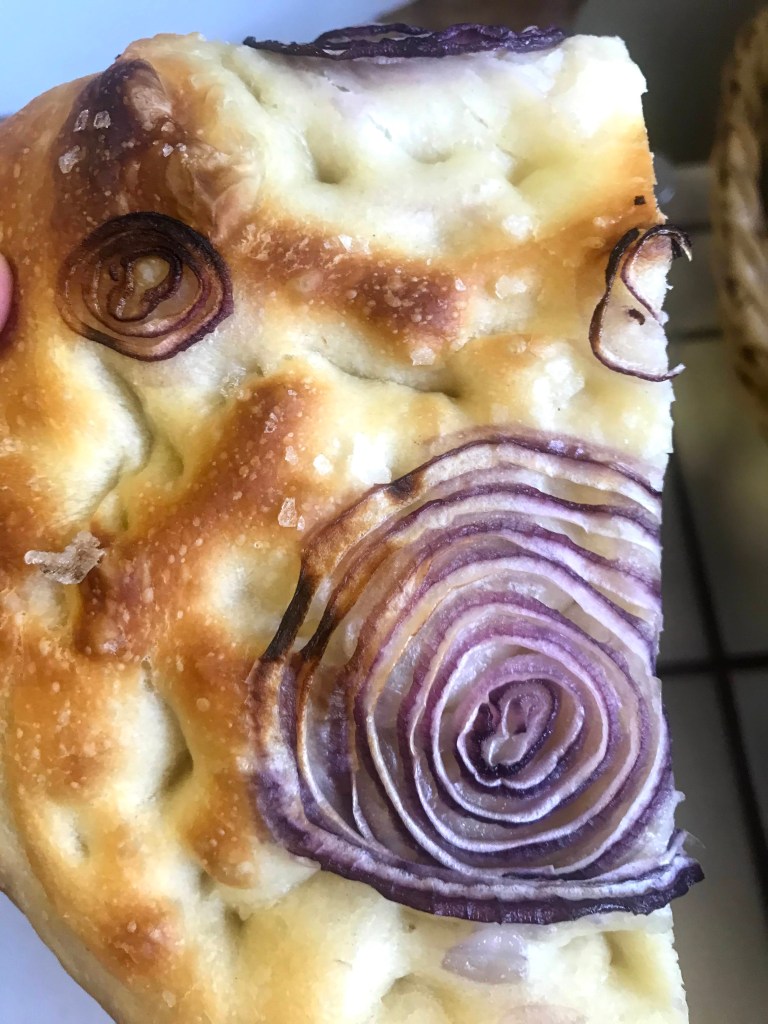 Making a sheet of focaccia bread lends itself to creativity when it comes to toppings. Sprinkle with minced garlic, scatter with fresh herbs, or add veggie slices. For this recipe, I used sliced red onion. It was delicious and very sweet.